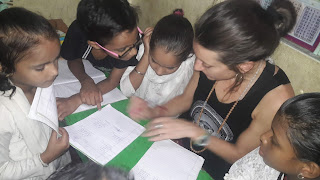 European Volunteer is in evening Classroom with lovely kids of Saraswati Education Center , Varanasi , Inda .